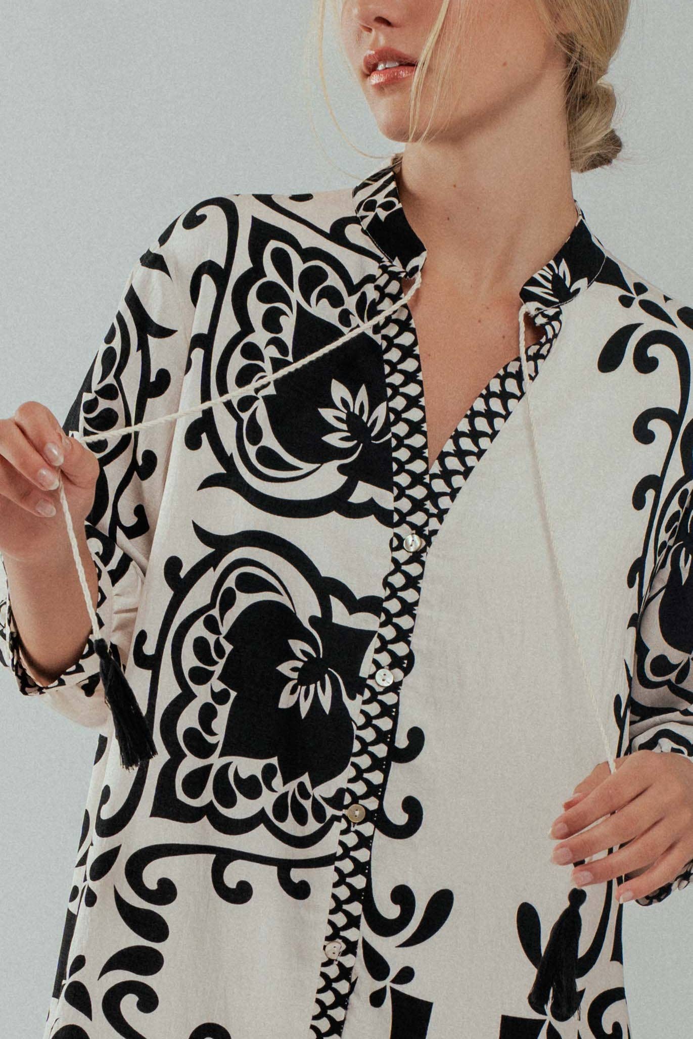 This stylish dress features intricate floral-inspired patterns, a tiered hemline, and tassel tie detailing at the neckline. Crafted from a lightweight viscose nylon blend, it offers a relaxed fit and breezy fabric, perfect for warm-weather styling. Features: • 91% Viscose, 9% Nylon • S-L: 2-2-2 • Bold black-and-white floral print • Tiered hemline • Tassel tie neckline with button accent • Made in China