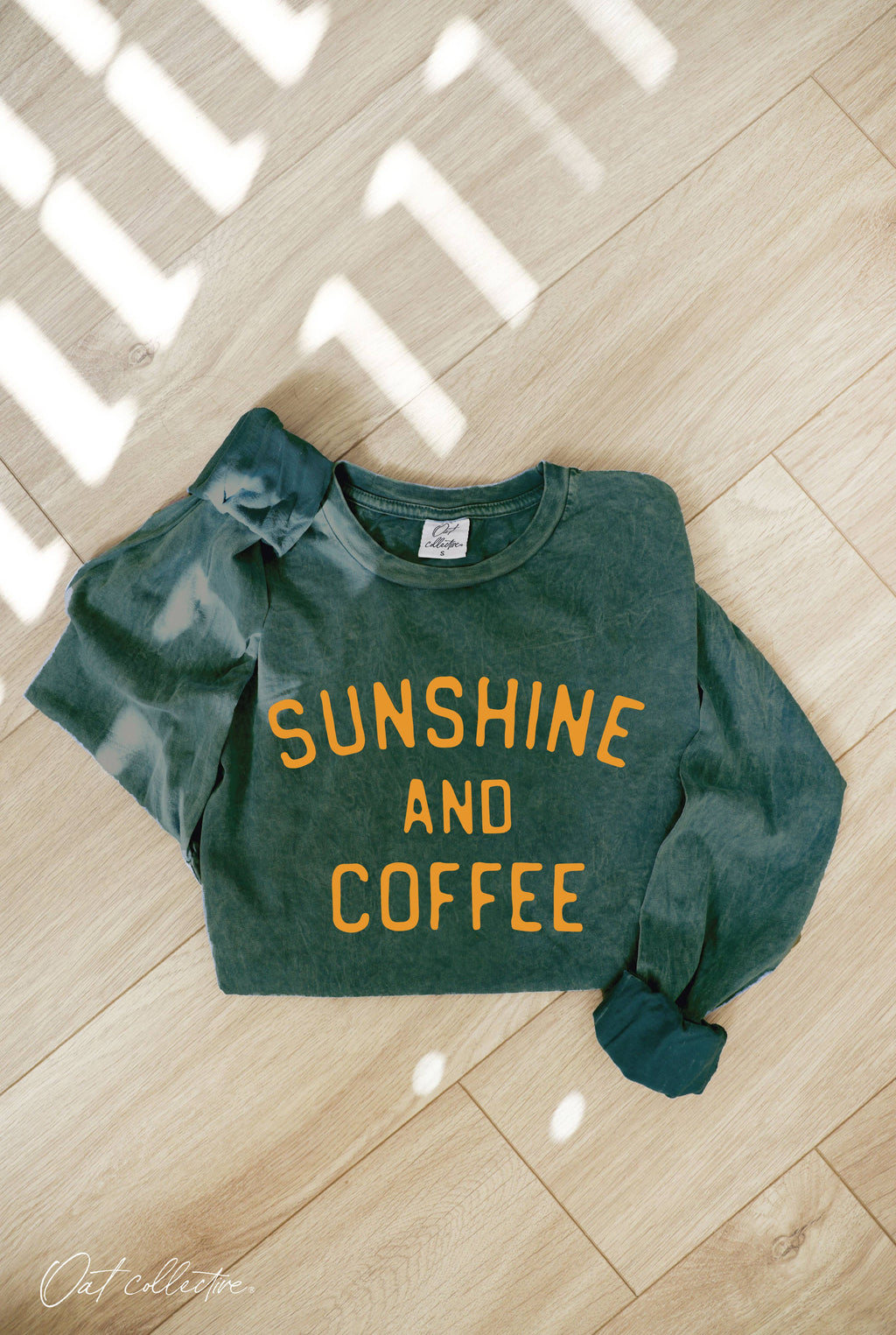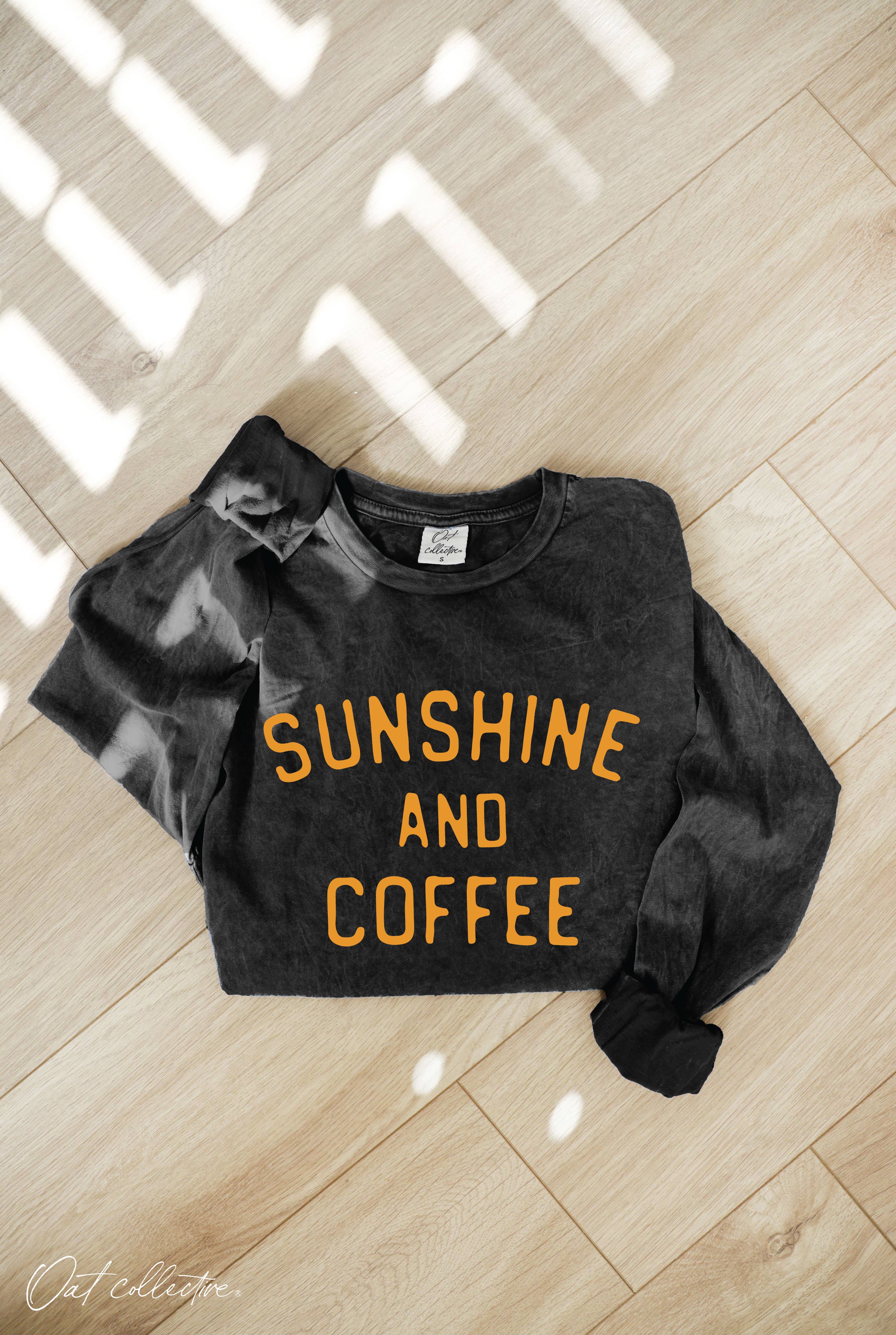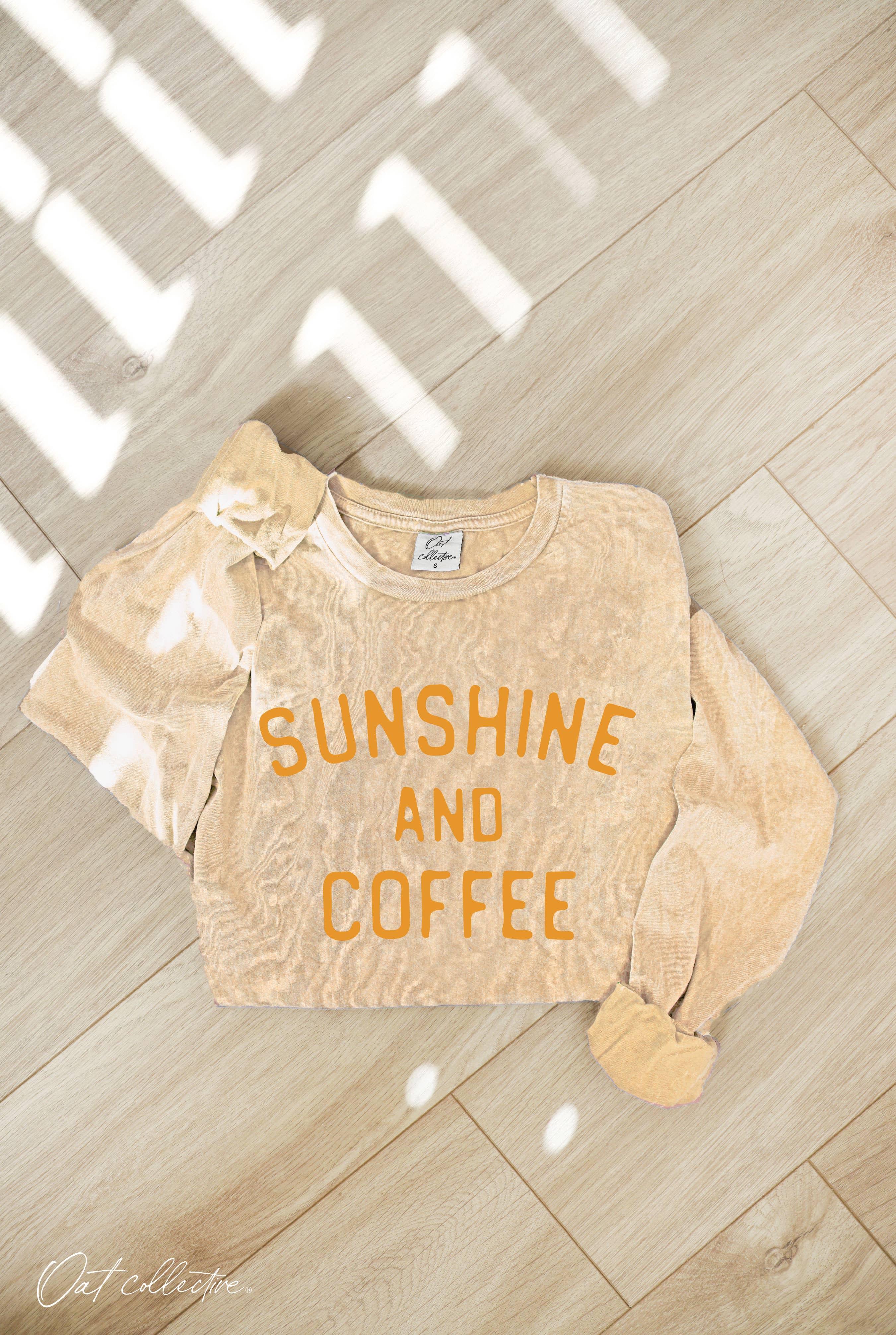 SUNSHINE AND COFFEE Mineral Washed Long Sleeve Graphic Top -100% Premium Cotton Jersey. -Relaxed Boxy Fit. -Cuffed Sleeves -Screen Printed with water based ink. -All items are slightly different because of the dying process of the garment. -Exclusive Oat collective Label.